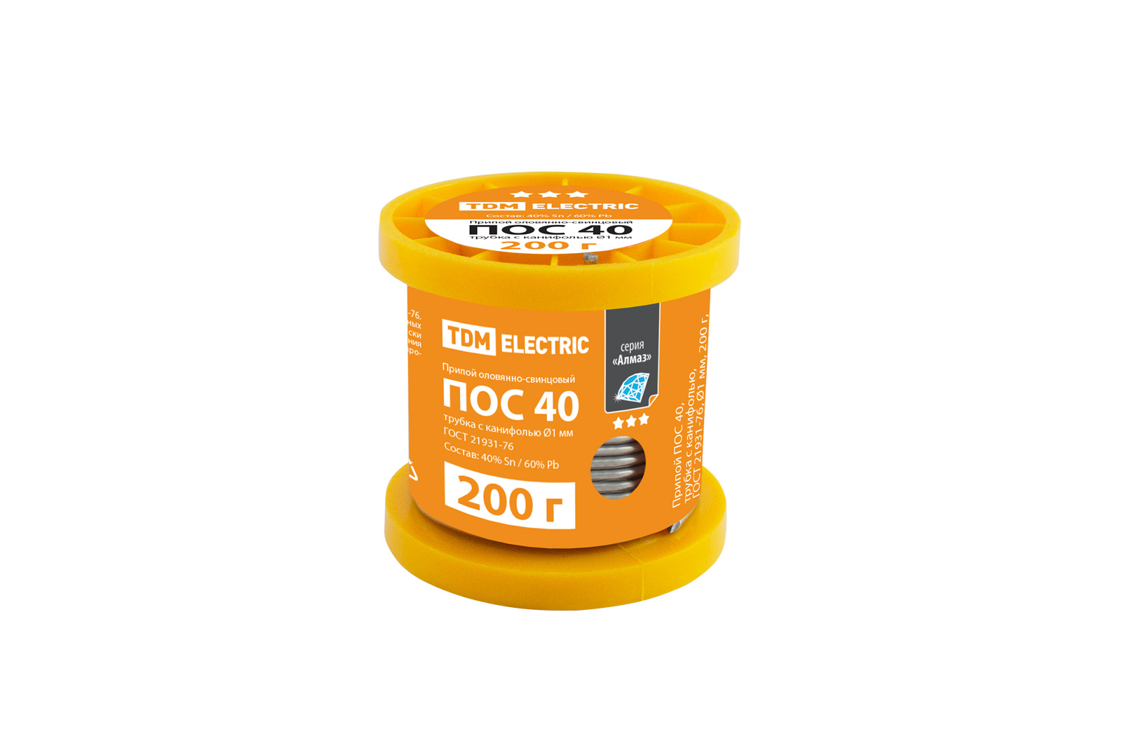 Припой ПОС 40, трубка с канифолью, ГОСТ 21931-76, Ø1 мм, 200 г, катушка, серия "Алмаз" TDM