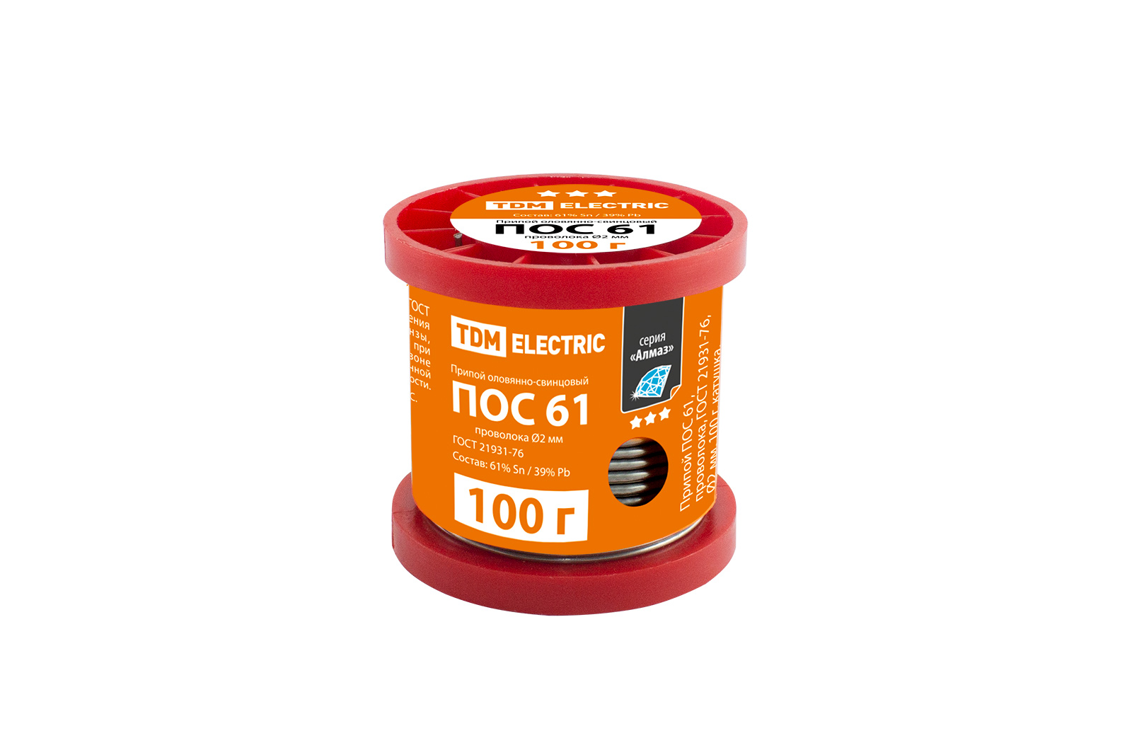 Припой ПОС 61, проволока, ГОСТ 21931-76, Ø2 мм, 100 г, катушка, серия "Алмаз" TDM