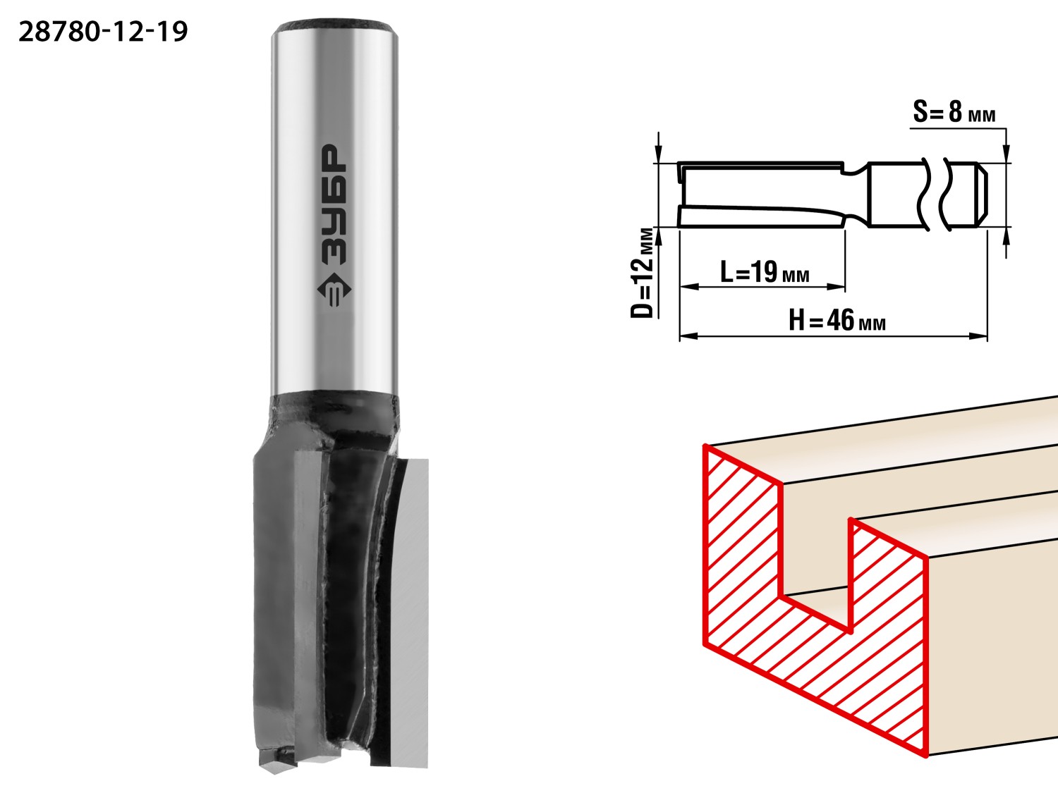 12x19мм, хвостовик 8мм, фреза пазовая прямая (B) ЗУБР