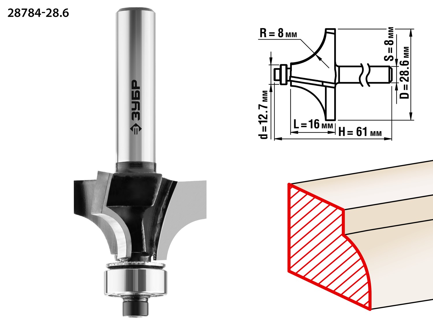 28,6x16мм, радиус 8мм, фреза кромочная калевочная №1 ЗУБР