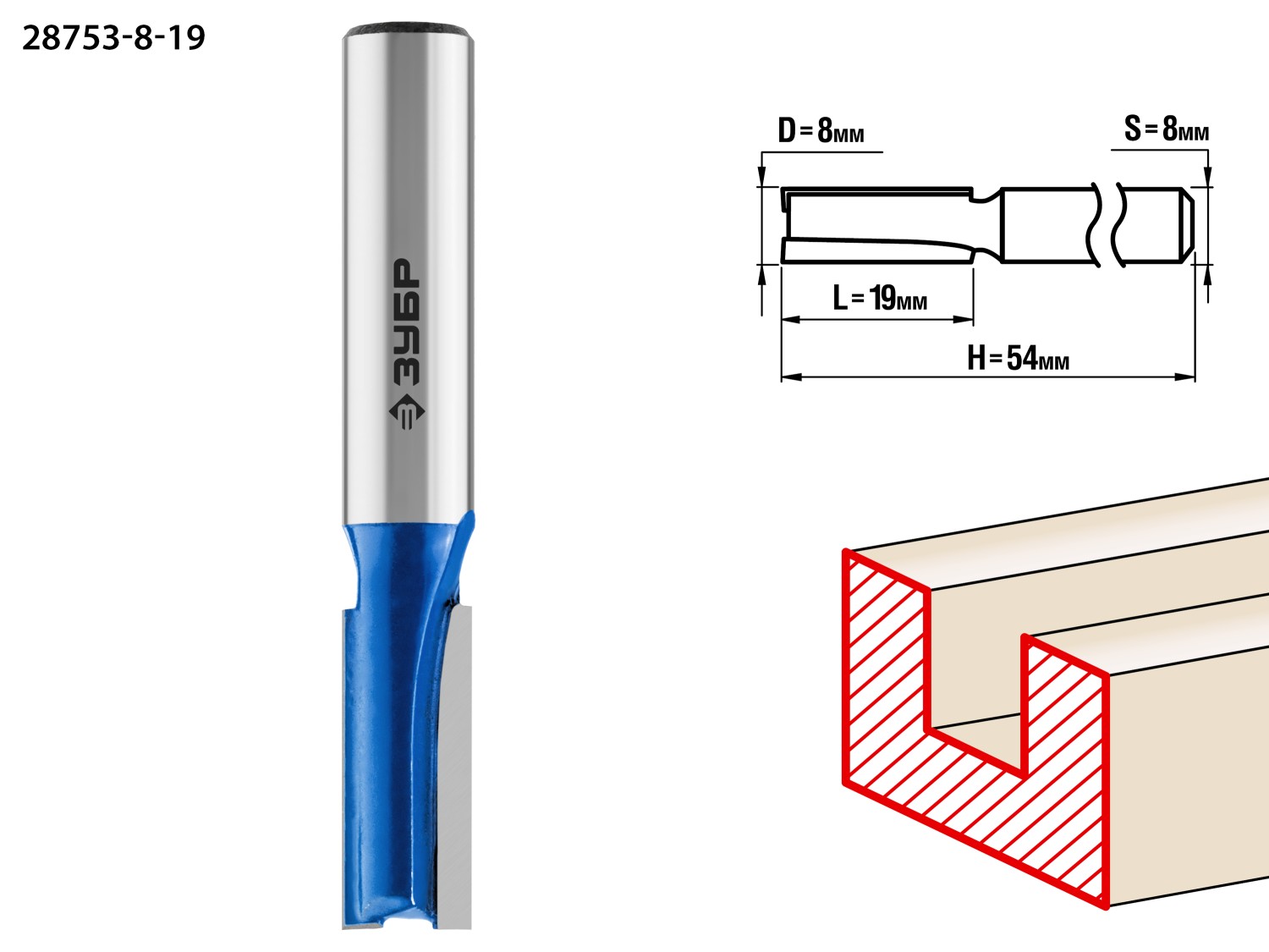 8x19мм, хвостовик 8мм, фреза пазовая прямая ЗУБР
