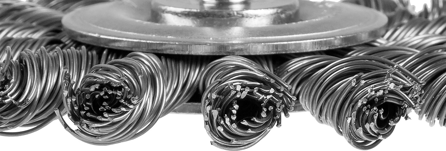 Регулярно очищайте кордщетку от остатков материала, не перегружайте инструмент во время работы и храните в сухом месте, чтобы избежать коррозии металлических кордов.
