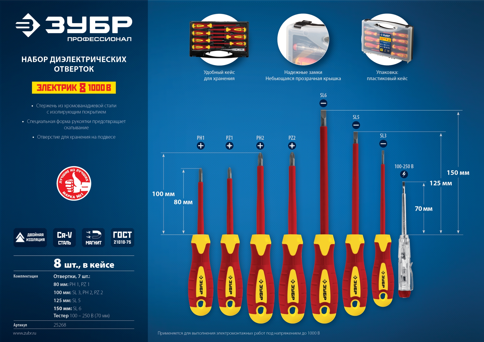 Набор: Отвертки SL 3, 5, 6 / PH 1, 2 / PZ 1, 2, тестер 100-250 В, "Профессионал" 25268, в кейсе, 8 предметов ЗУБР доступен в интернет‑магазине ВольтМаркет в Оренбурге. Покупая у нас, вы получаете дополнительные преимущества: