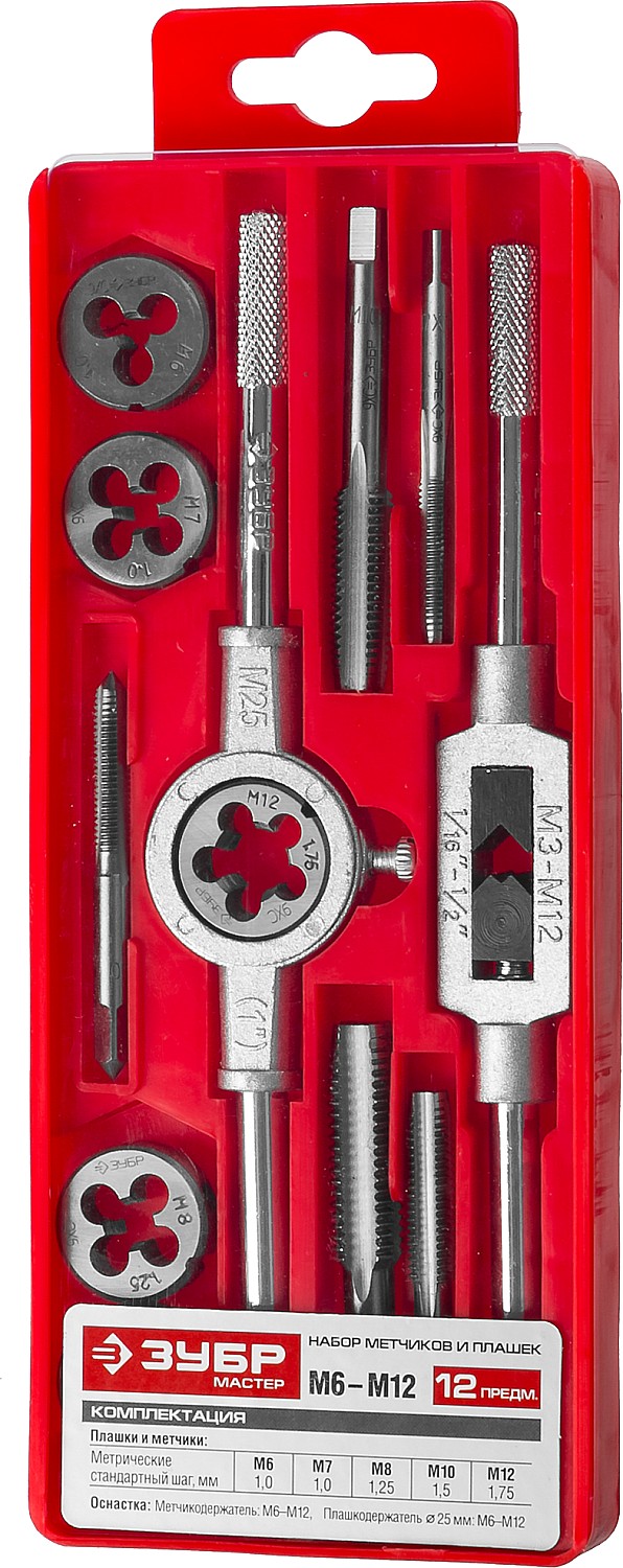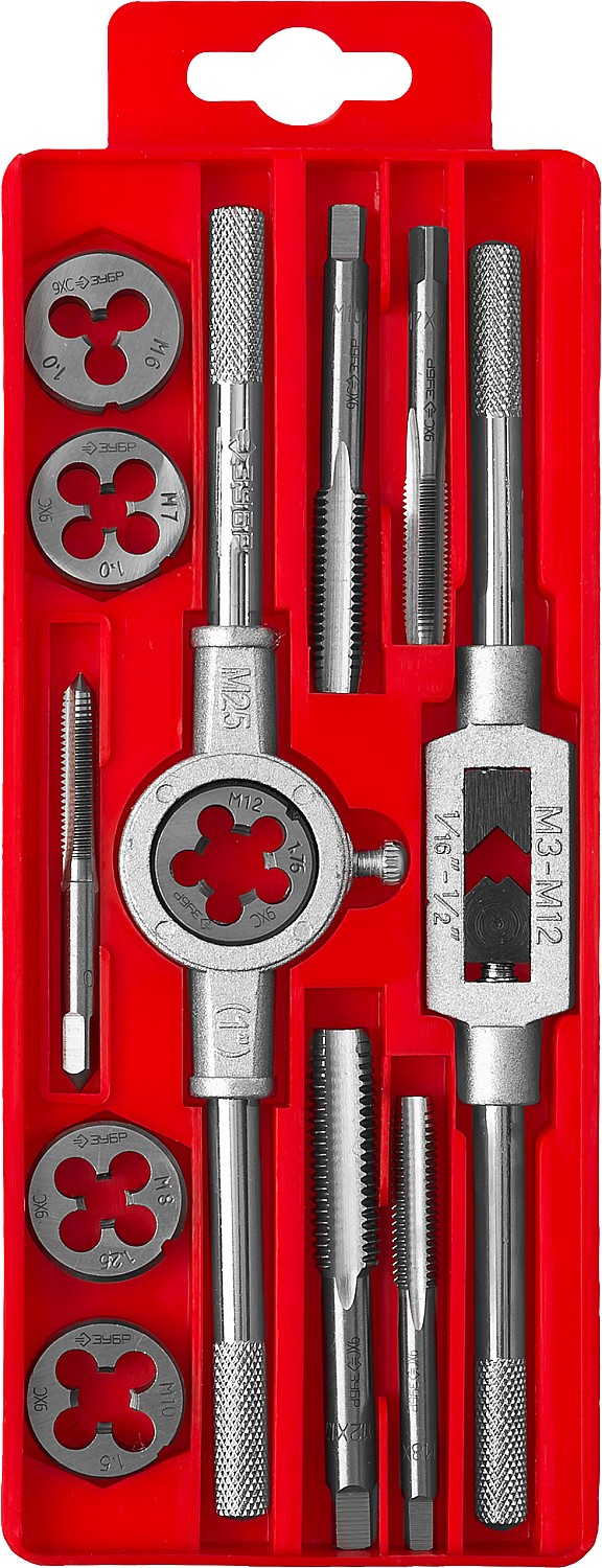 12 предметов, набор метчиков и плашек в пластиковом боксе, сталь 9ХС ЗУБР