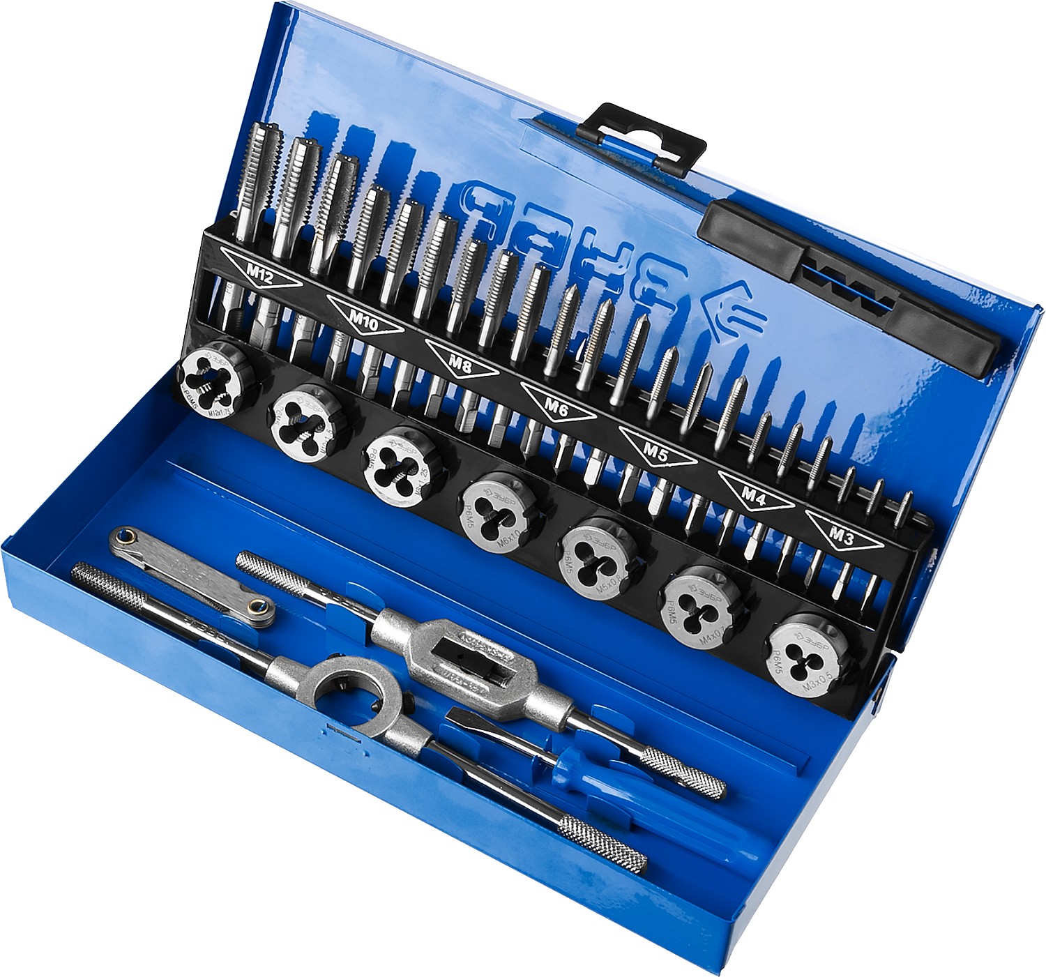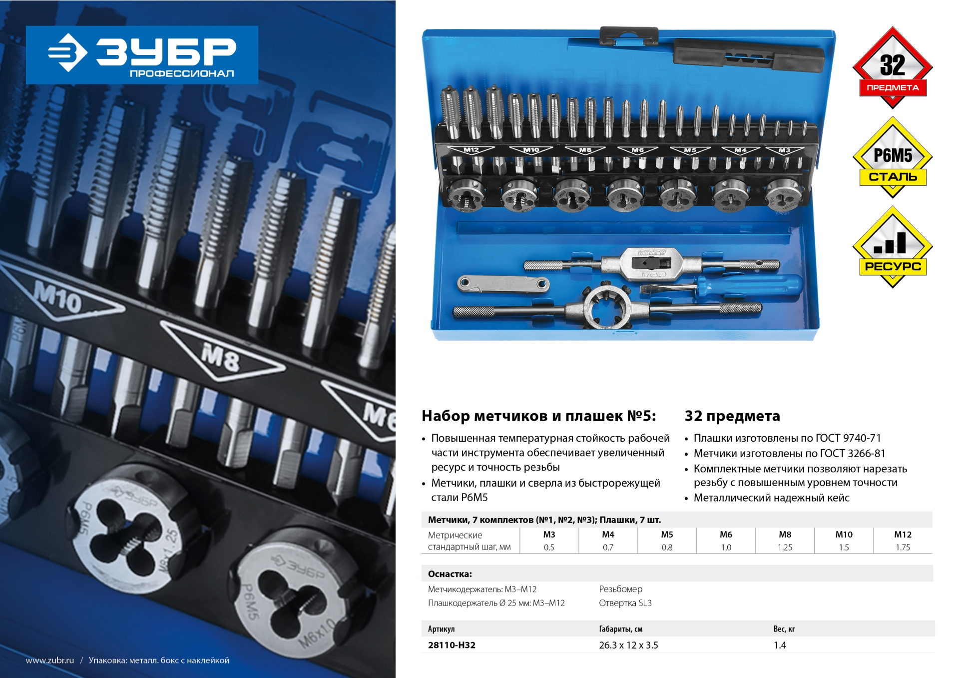32 предмета, набор метчиков комплектных и плашек, сталь Р6М5 ЗУБР