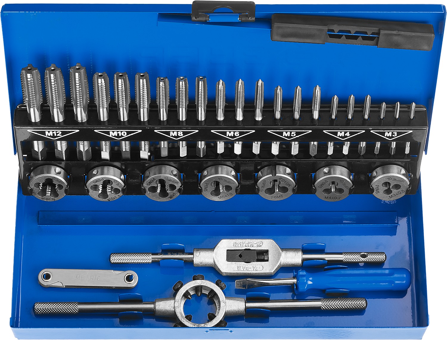 Набор резьбонарезного инструмента обычно включает в себя метчики, плашки, воротки, развертки и иногда калибры для контроля резьбы. Такой комплект позволяет выполнять нарезку внутренней и наружной резьбы различных размеров.