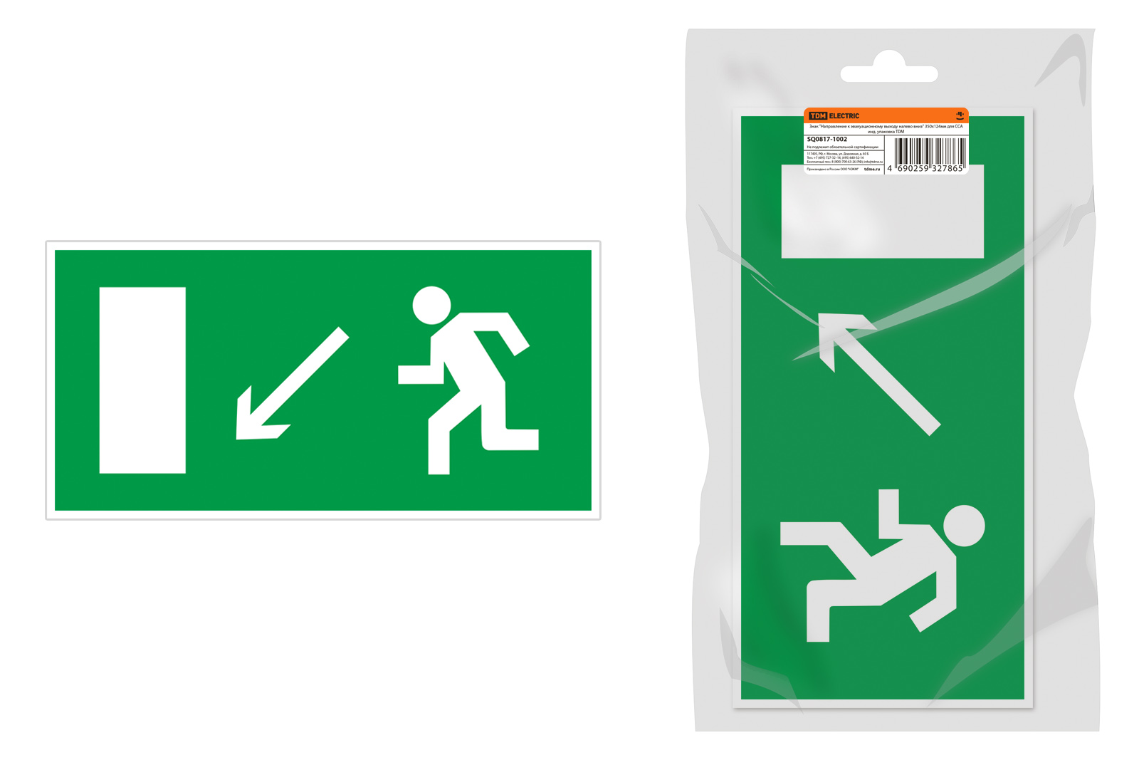 Знак "Направление к эвакуационному выходу налево вниз" 350х124мм для ССА инд. упаковка TDM
