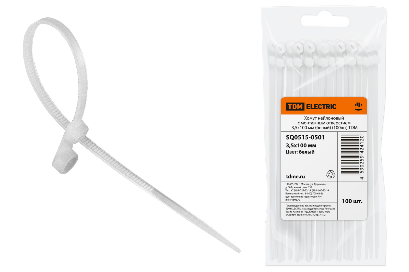 Хомут нейлоновый с монтажным отверстием 3,5х100 мм (белый) (100шт) TDM