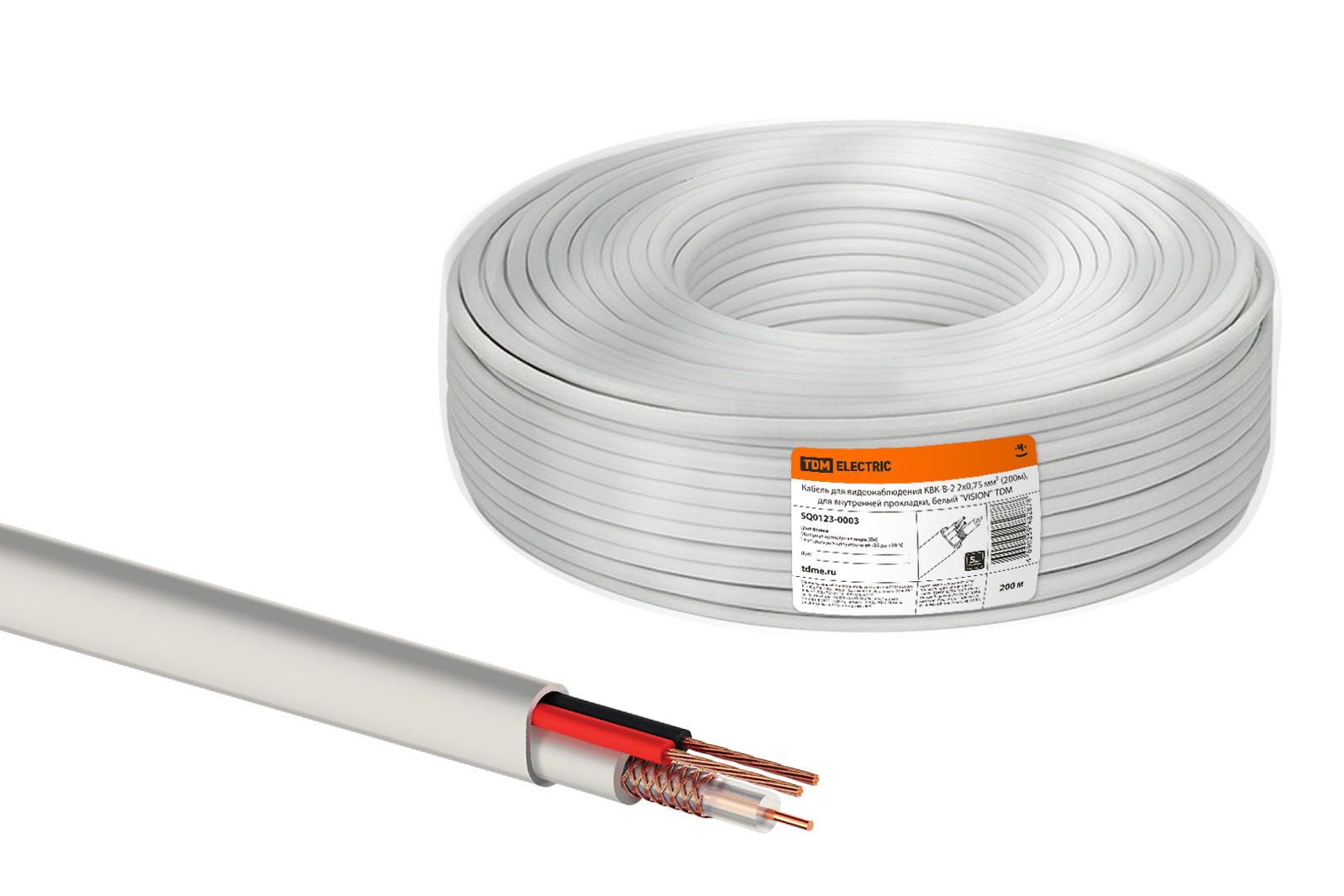 Кабель для видеонаблюдения КВК-В-2 2х0,75 мм² (200м), для внутренней прокладки, белый "VISION" TDM