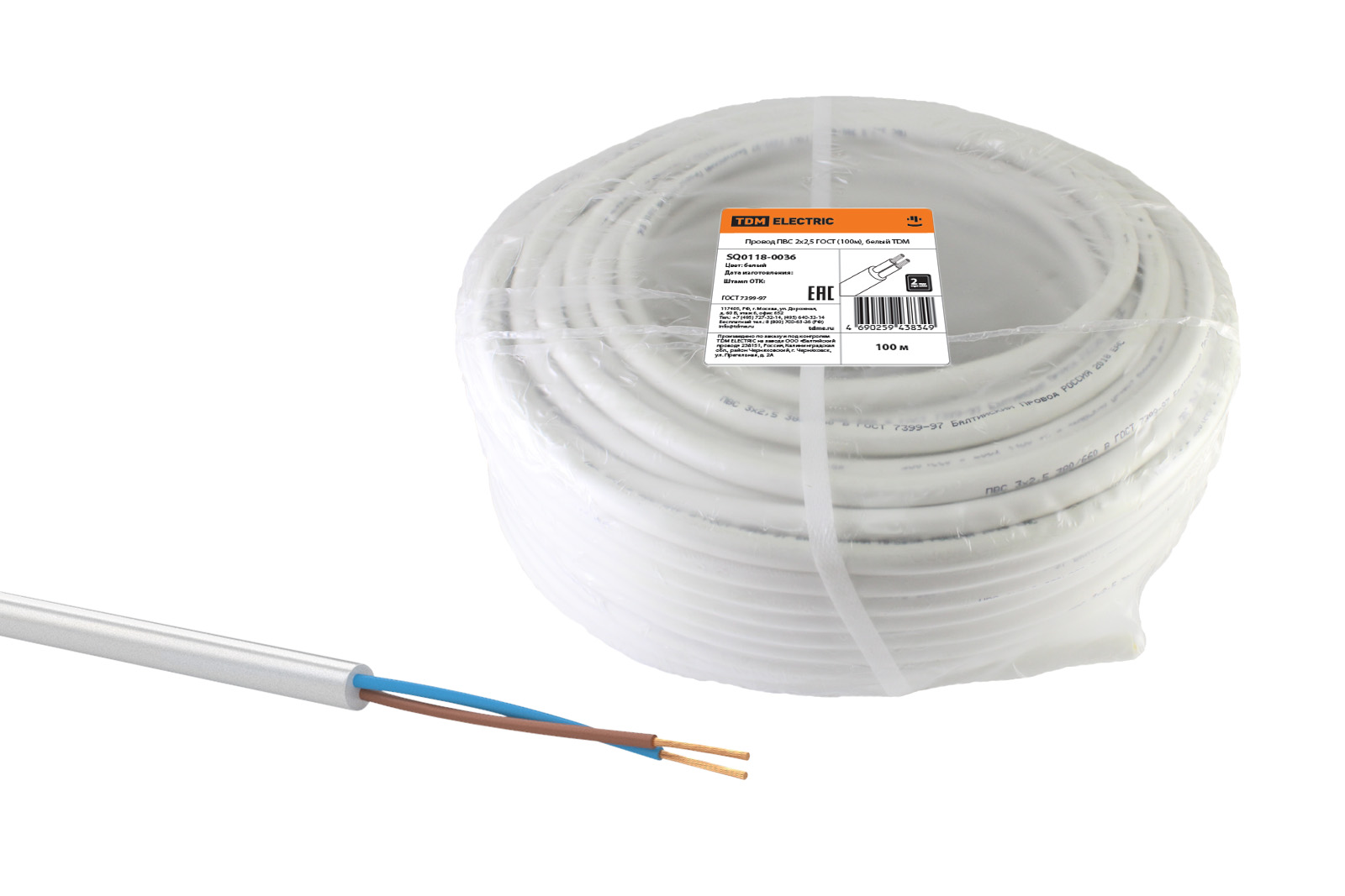 Провод ПВС 2х2,5 ГОСТ (100м), белый TDM