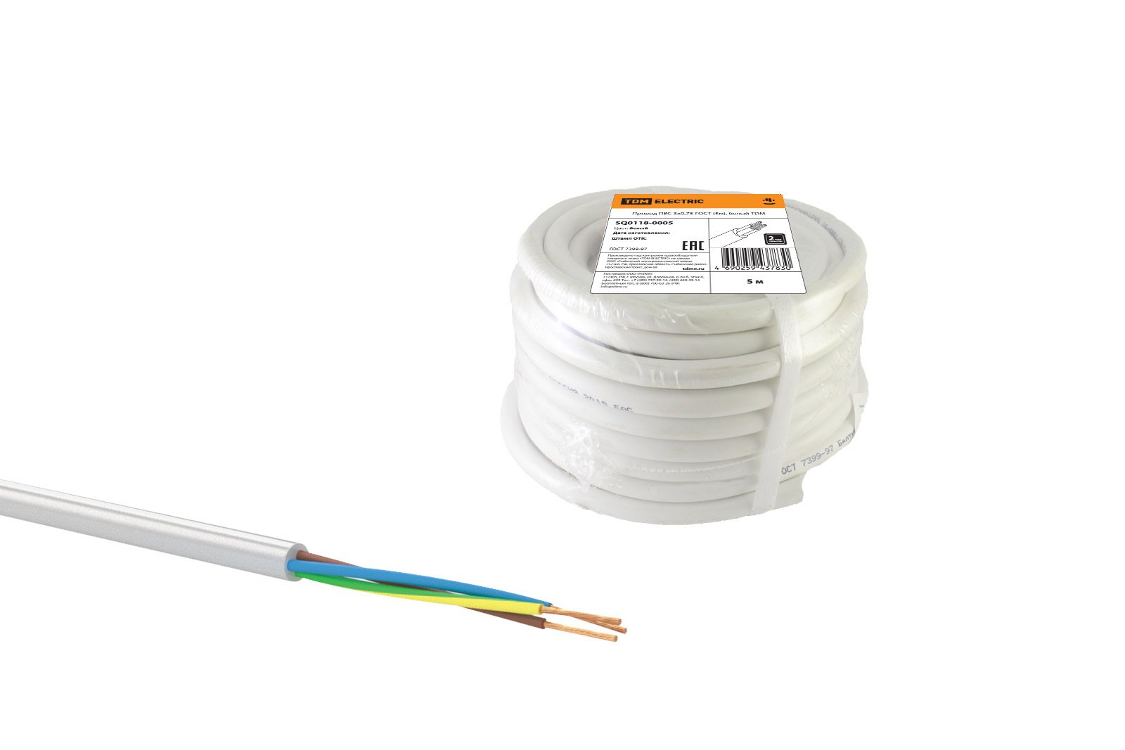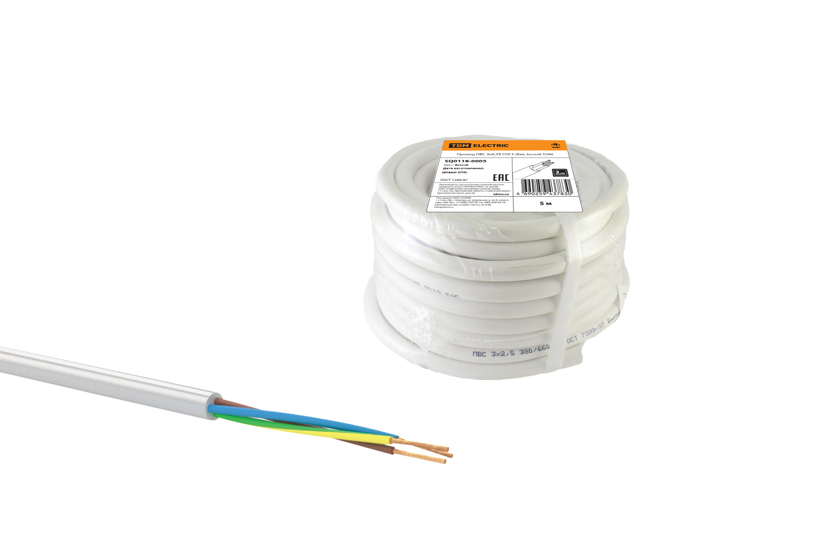 Провод ПВС 3х0,75 ГОСТ (5м), белый TDM