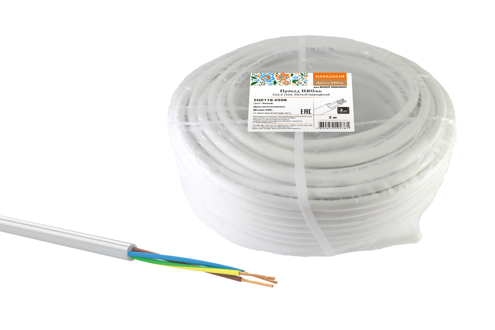 Провод ПВСмб 3х2,5 (5м), белый Народный
