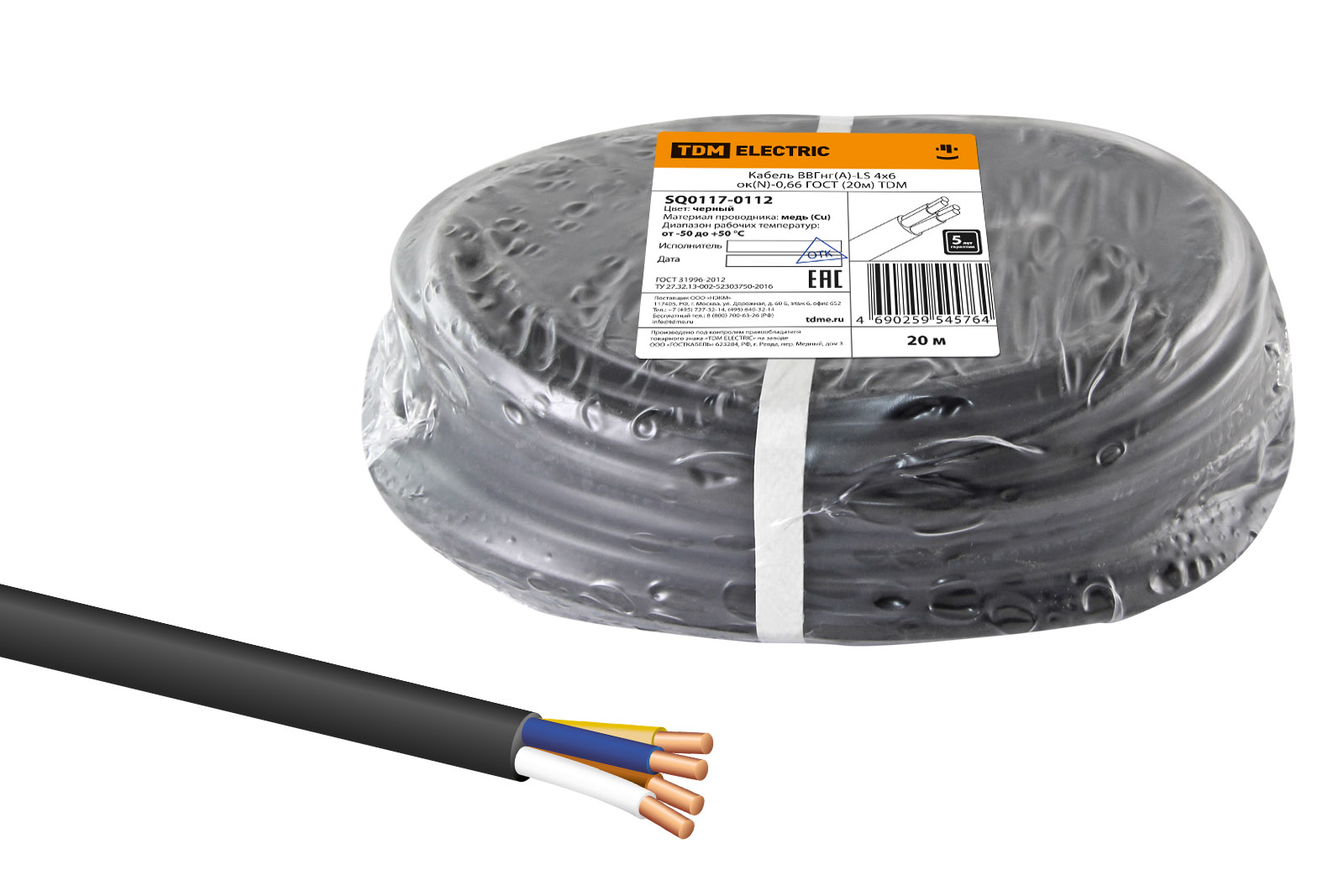 Кабель ВВГнг(А)-LS 4х6 ок(N, PE)-0,66 ГОСТ (20м) TDM