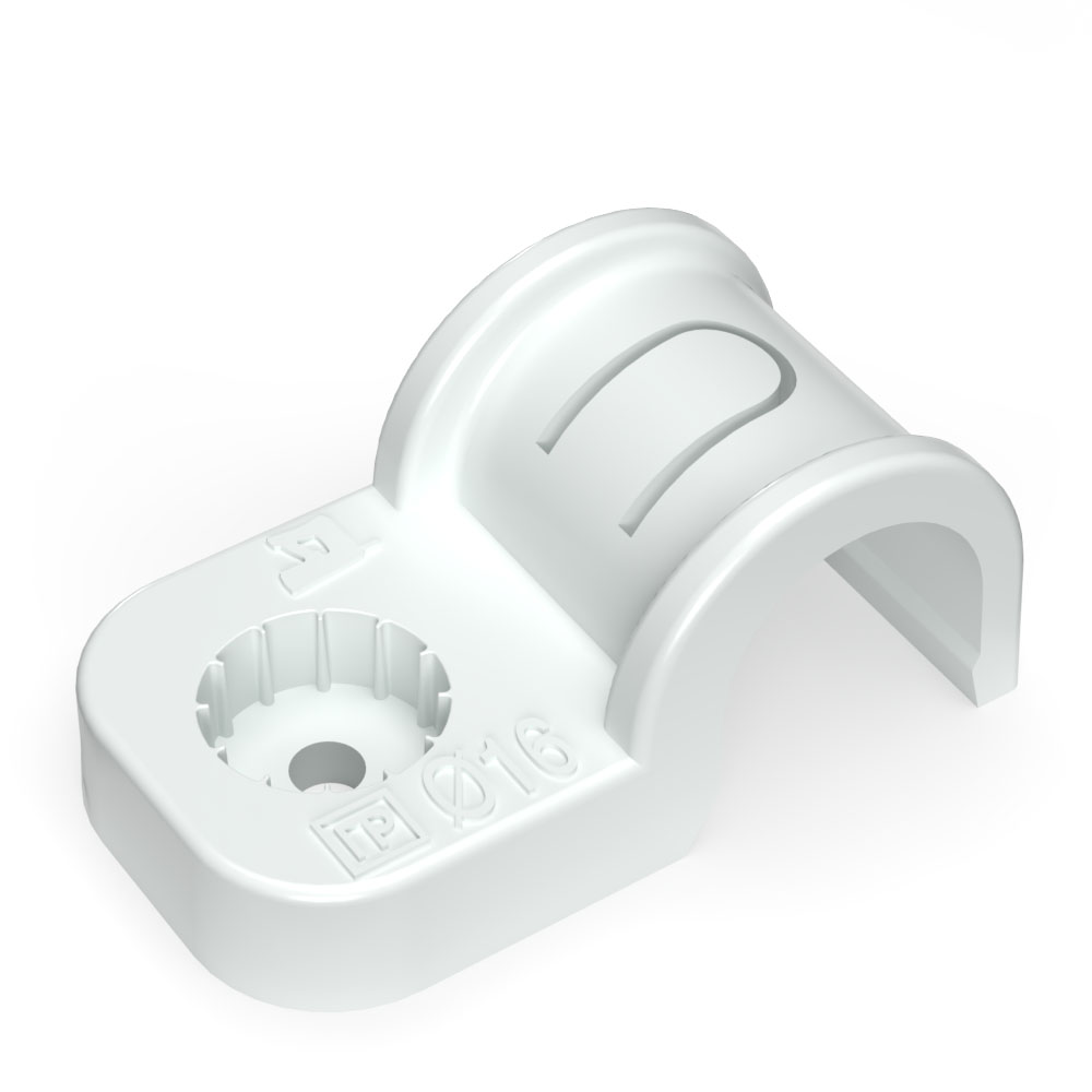 Крепеж-скоба пластиковая односторонняя для прямого монтажа атмосферостойкая белая в п/э d16 мм (50шт/750шт уп/кор) Промрукав