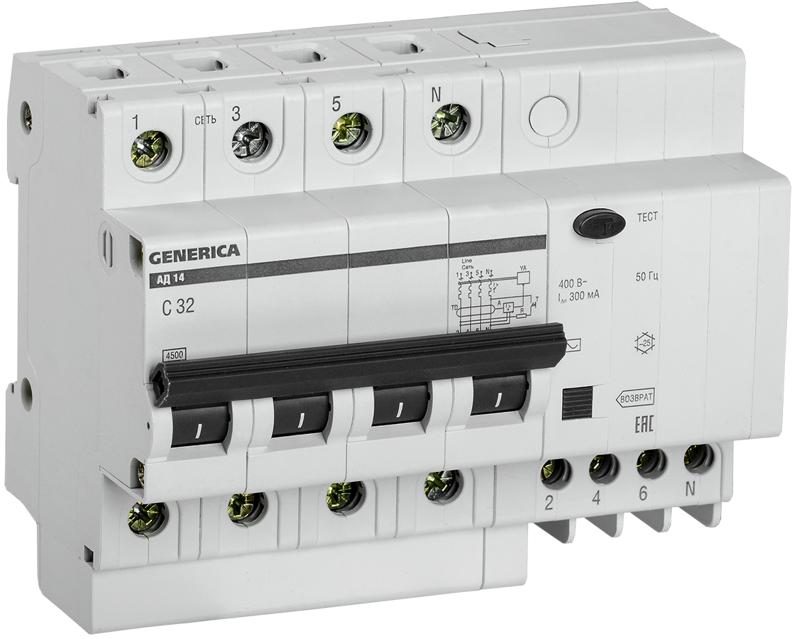 Дифференциальный автоматический выключатель АВДТ АД14 4П 32А 300мА GENERICA