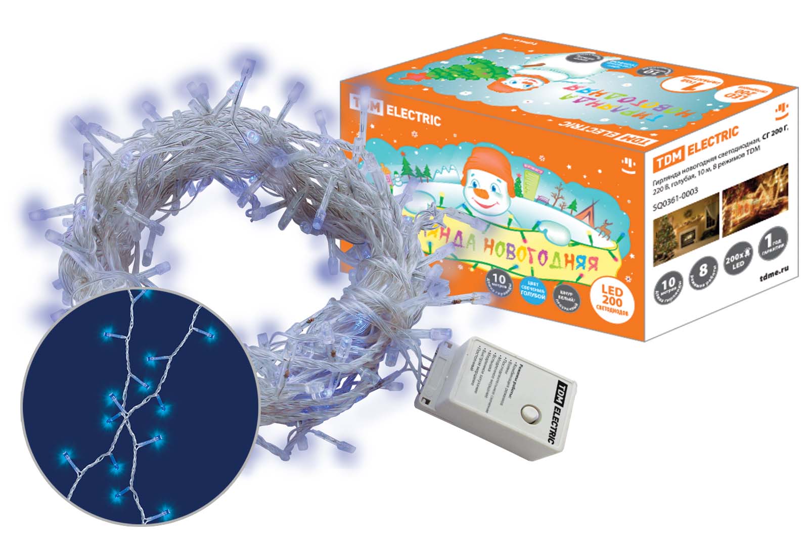 Гирлянда новогодняя светодиодная, СГ 200 Г, 220 В, голубая, 10 м, 8 режимов TDM