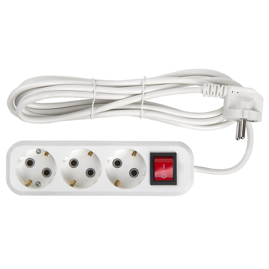 Удлинитель бытовой GES-10-3x075-3-3m-S, 10А, 3х0,75 мм2, 3 места, 3 метра, с заземлением, с выключателем B General