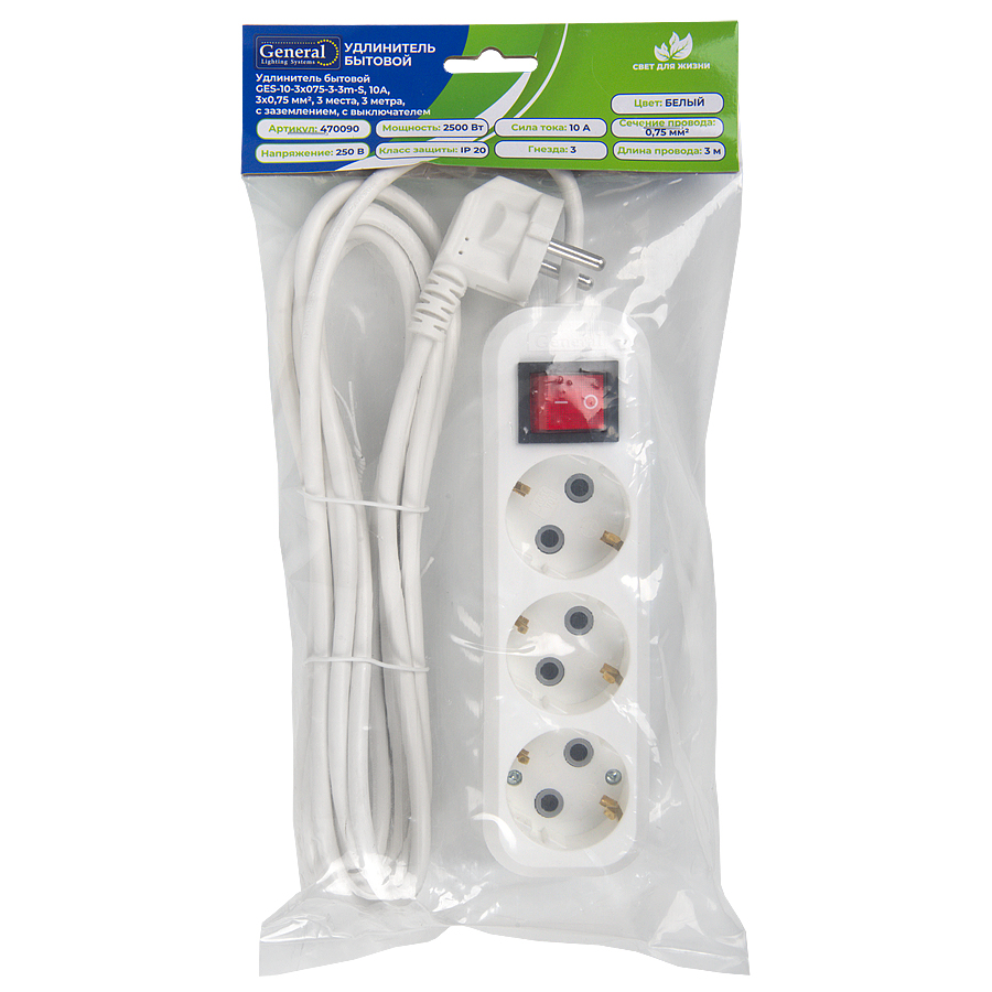 Удлинитель бытовой GES-10-3x075-3-3m-S, 10А, 3х0,75 мм2, 3 места, 3 метра, с заземлением, с выключателем B General доступен в интернет‑магазине ВольтМаркет. Покупая у нас, вы получаете дополнительные преимущества: