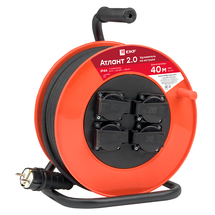 Удлинитель на катушке "Атлант 2,0" 4 гнезда 40м с заземлением ПВС 3*1,5 16А/3,5кВт IP44 PROxima EKF доступен в интернет‑магазине ВольтМаркет. Покупая у нас, вы получаете дополнительные преимущества: