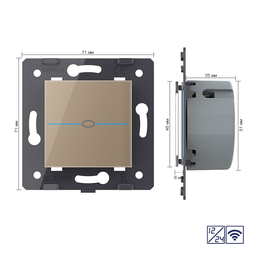 Одноклавишный сенсорный выключатель Quadro 12/24В с радиоупр., цвет золотой (механизм) Livolo