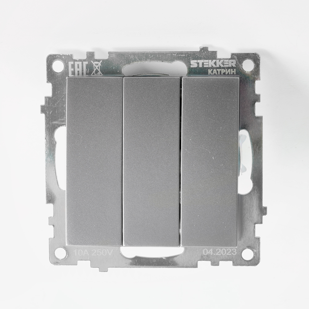 Выключатель 3-клавишный (механизм), STEKKER GLS10-7108-03, 250V, 10А, серия Катрин, серебро