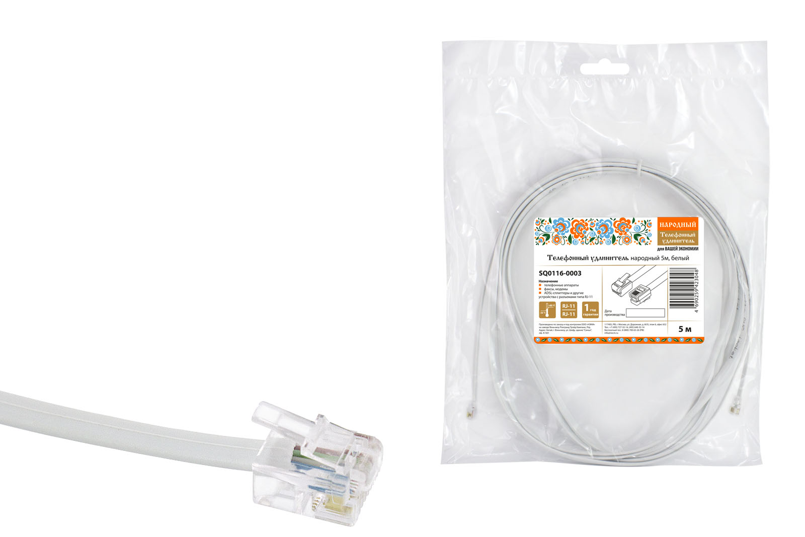 Телефонный удлинитель народный 5м, белый